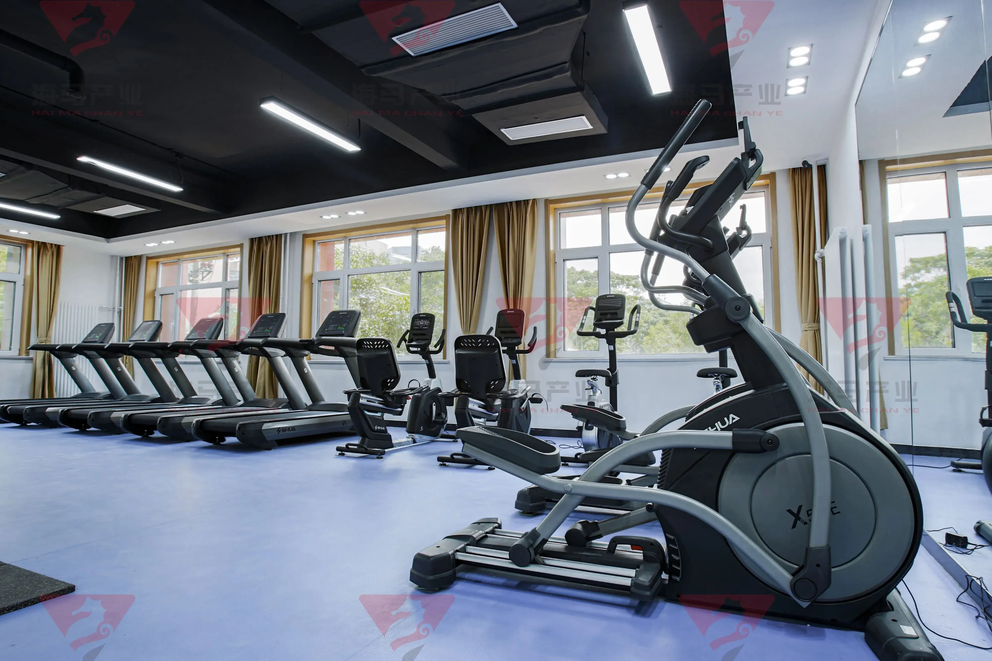 二层为动感单车、跑步机、私教区域以及其他力量健身区;合计面积约为300平方;主要为有氧运动以及力量训练。